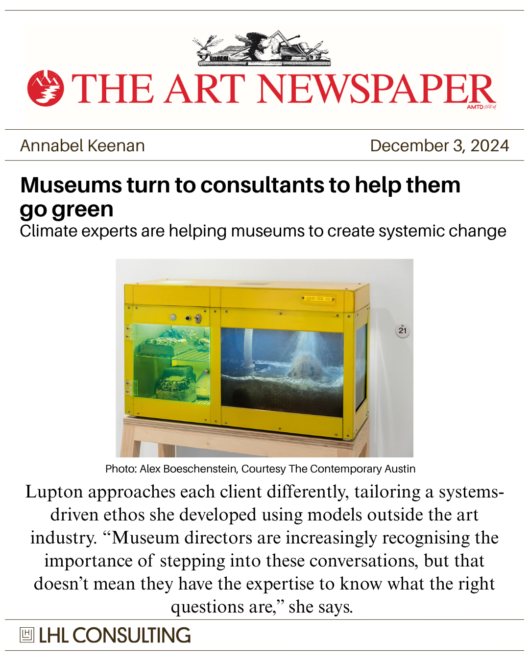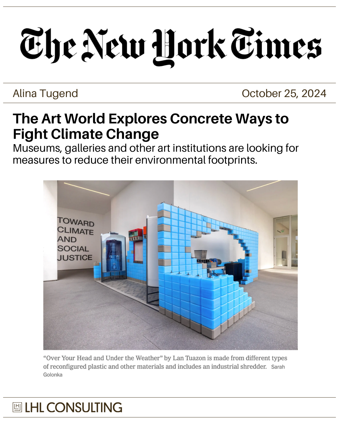 She developed a first of its kind Climate Impact Program for Getty as part of the landmark PST ART exhibition series across Southern California; launched the first exhibitor booth Climate Impact Reporting initiative for an art fair at ADAA’s The Art Show; founded the artist- and worker-led art and climate initiatives Artists Commit and Galleries Commit; and has completed climate impact strategy work with clients like MOCA, Hauser & Wirth, and the Pulitzer Arts Foundation.